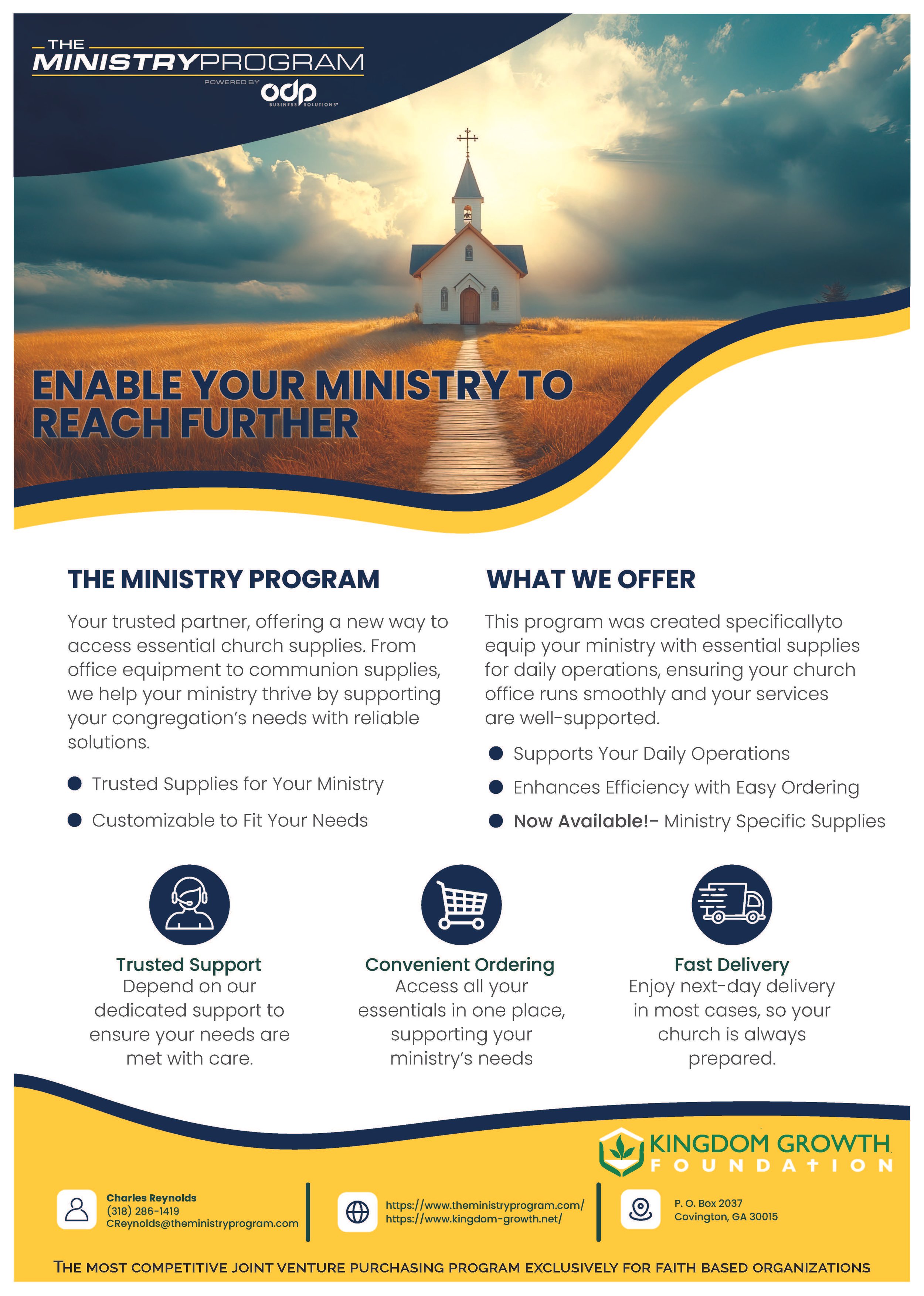 The foundation also formed a partnership with The Ministry Program to offer churches an alternative source for supplies they need for everyday operations, office supplies, furniture, etc. This will help churches stretch their budgets further while still receiving excellent customer service within an organization created specifically for churches and ministries.